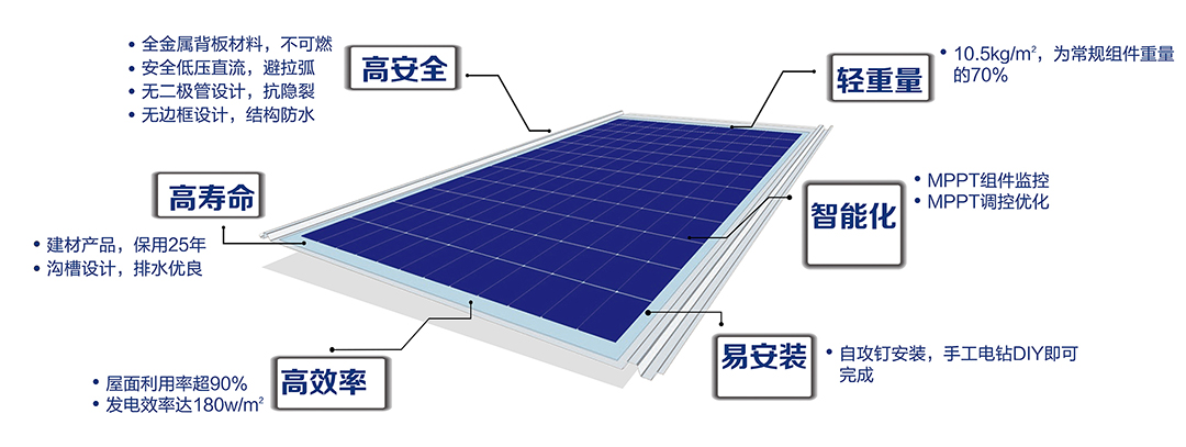 本次项目屋顶选用赫里欧新型智能BIPV发电建材,不仅符合节能建筑的理念,节省彩钢瓦材料,还能高效发电产生清洁能源,并能防水隔热。项目采用“替换式”安装的方式,用BIPV 光伏瓦直接代替常规彩钢瓦作为屋顶材料,具有防火、防水、隔热保温、承重、高寿命、高发电、低压安全、智能化的优势特点。