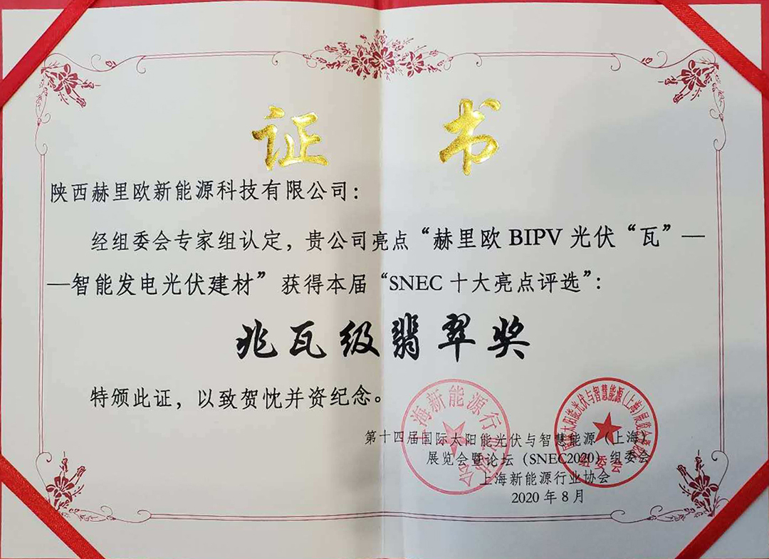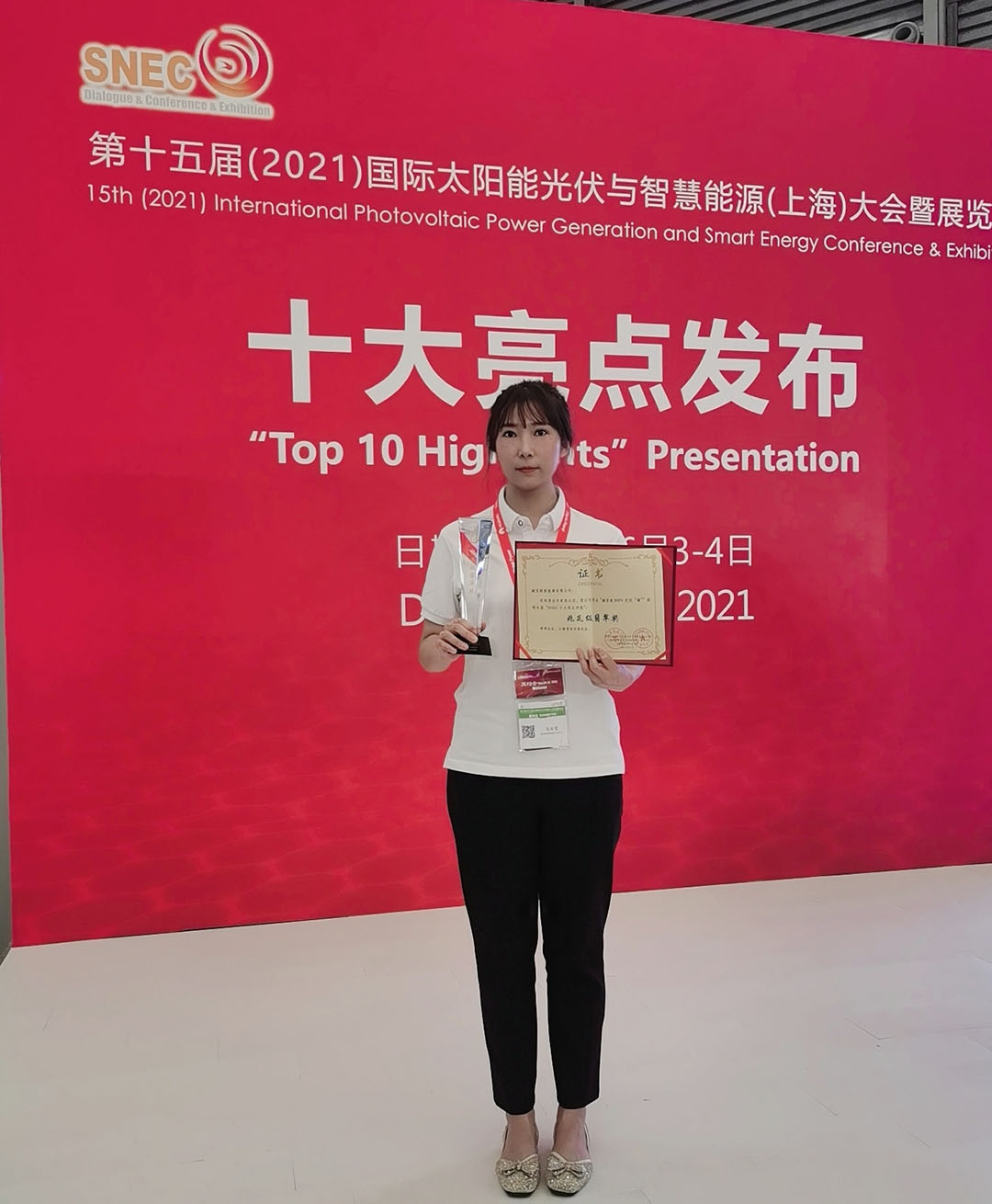 2.2020年荣获上海光伏展十大发明创新奖第一名和兆瓦级翡翠奖(中国太阳能协会)