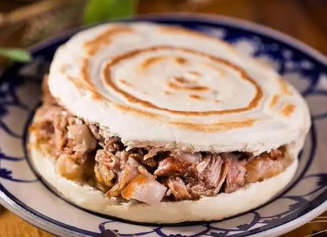 肉夹馍是中国陕西省传统特色食物之一。名字意为“肉馅的夹馍”。