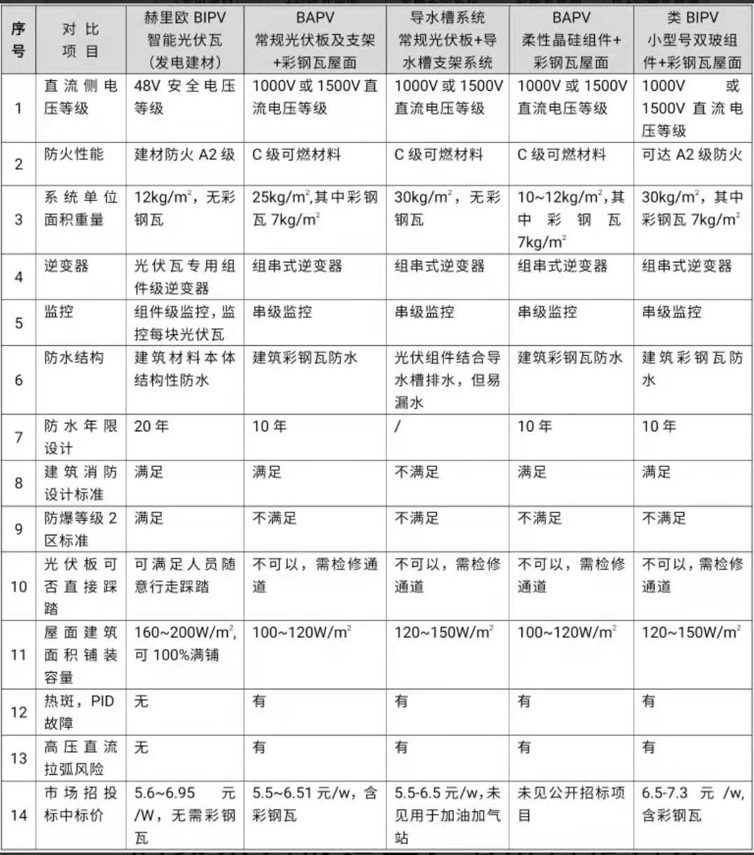 以下为当前各类应用于加油站的罩棚屋面光伏发电的技术方案及投资报价对比,无疑赫里欧更具优势,并完美满足加油加气站防火防爆的应用场景。