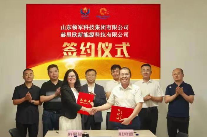 2021年7月6日下午,山东领军科技集团及赫里欧新能源有限公司举行合资协议签署仪式。赫里欧新能源总经理崔永祥、新能源事业中心总经理牛英哲;山东领军科技集团有限公司董事长李香祖、副总裁李雪燕等相关领导及负责人共同出席签约仪式。