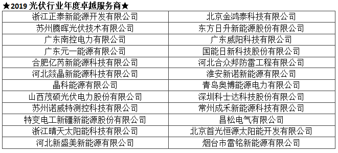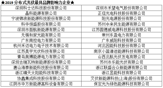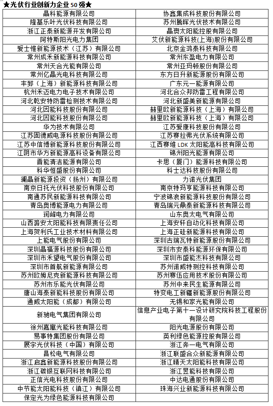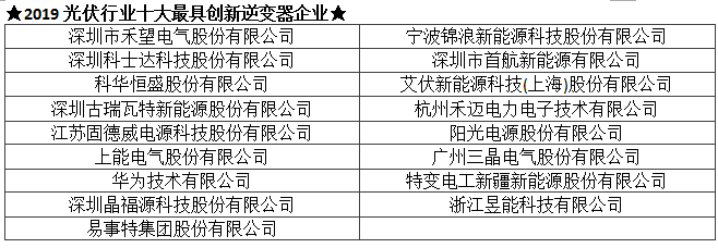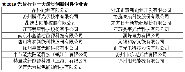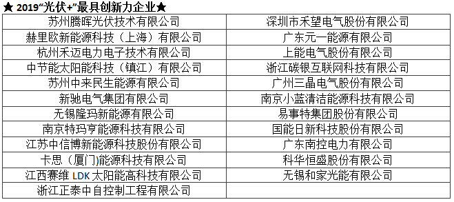 TOP 2019光伏行业创新力企业50强及各单项奖入围企业名单(排序不分先后):