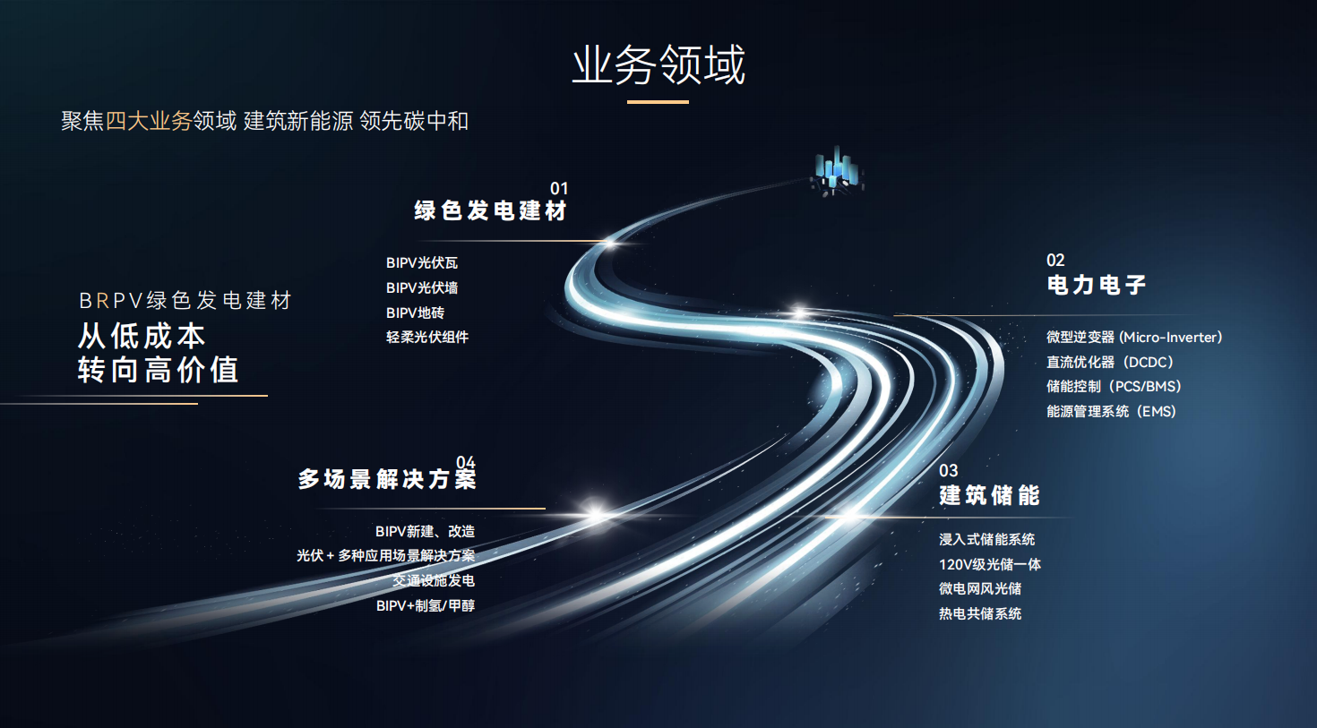 公司依托发电建材系统(定义为发电建材BRPV)的研发与制造、建筑综合能源解决方案服务、建筑新能源系统资产的运维及咨询服务三大业务领域。从产品角度看为四大业务板块(如下图)