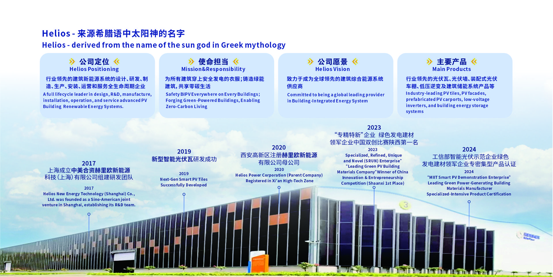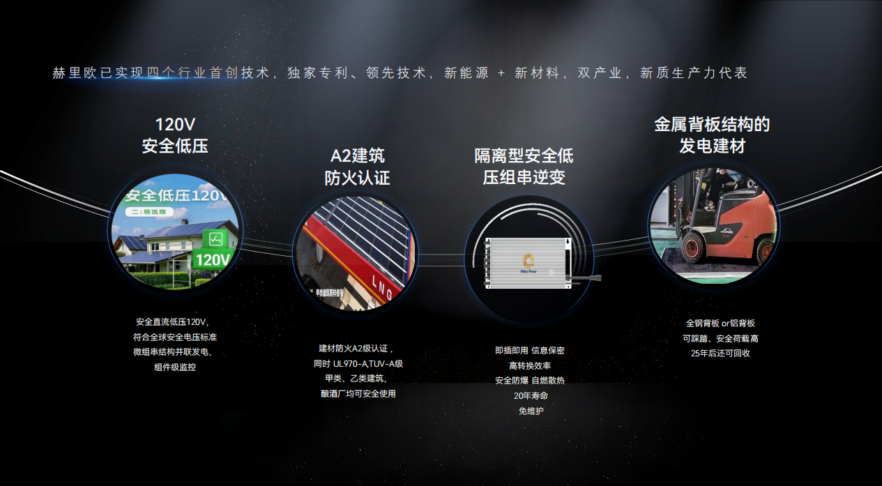 赫里欧新能源有限公司注册于西安高新区,专注于新型绿色智能发电建材系统(BRPV®)的国家高新技术企业,致力于低电压、高安全、防火、防水、智能建材化光伏系统产品的研发、制造和销售,为客户提供各类建筑光伏一体化场景(BIPV)的解决方案。赫里欧坚持打造3A(中国建材防火A级,美标UL790—A,欧标TUV—A)发电建材,隔离型低压组串逆变器,AI智能EMS能源管理系统,形成直流侧120V安全区BIPV生态,以“为所有建筑穿上安全发电的衣服”为使命,致力于成为“全球领先的建筑综合能源系统提供商”,铸造绿能建筑,共享零碳生活。
