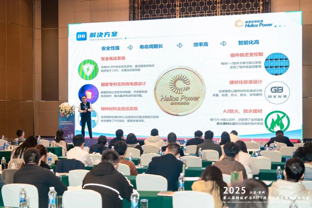 本届论坛汇聚了数百家产业链上下游头部企业,45%参会者为CTO/CEO级别决策者,堪称BIPV领域的“全明星阵容”。大会围绕钙钛矿/BIPV技术突破、标准体系构建、工程实践落地与市场趋势研判等核心议题展开深度交流,共同探索千亿级绿色建筑新蓝海。 张文博总经理在题为《建筑与能源的完美融合—赫里欧推动绿色建筑革命》的演讲中系统阐述: “传统光伏存在高压直流拉弧、热斑效应、PID衰减、防火隐患等痛点,难以真正融入建筑本体。而赫里欧重新定义BIPV—我们不做‘加装’,而是让建材本身会发电。”