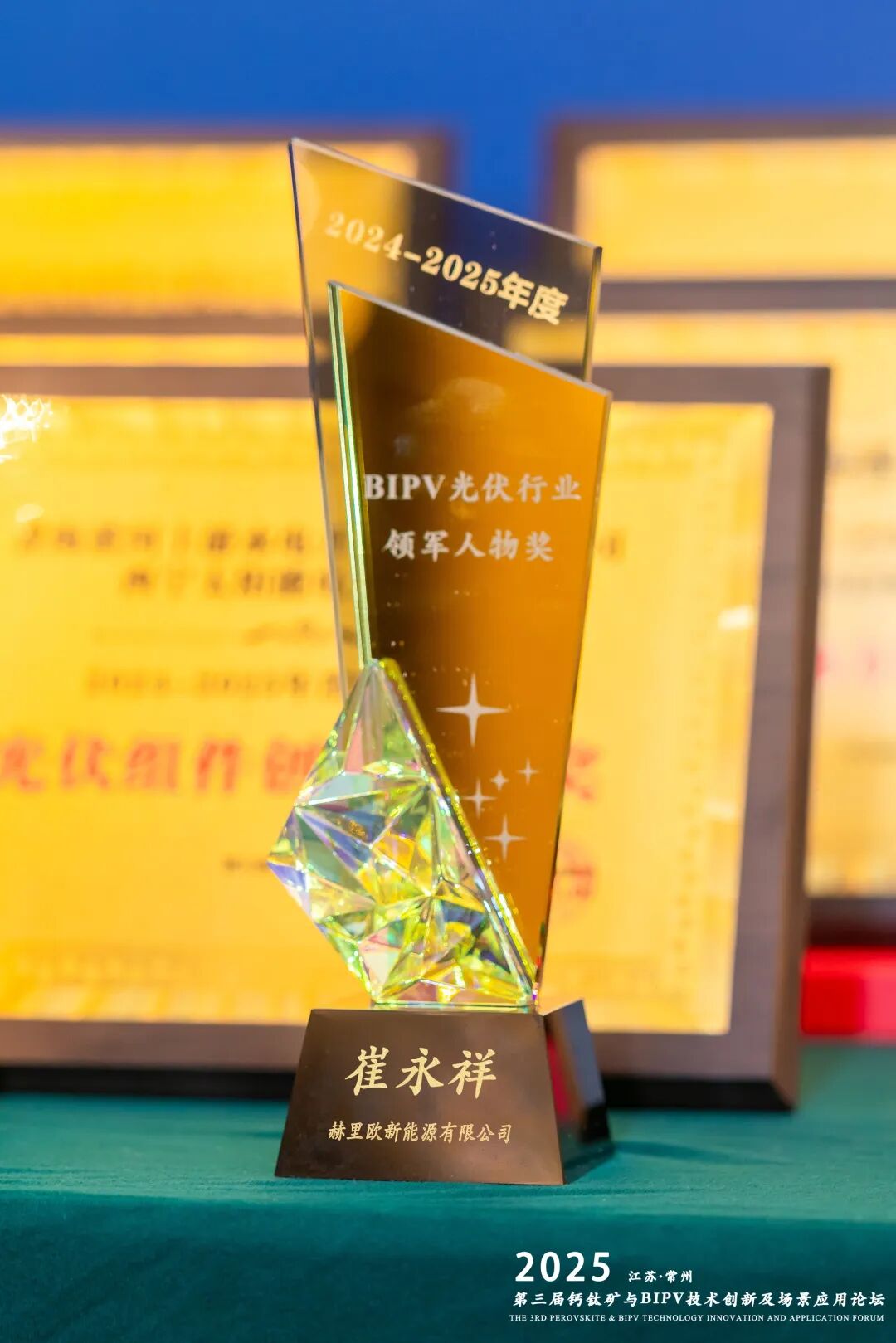 在本次论坛的颁奖典礼上,赫里欧凭借其安全、高效、智能、建材化的全栈式BIPV解决方案,荣获: ■ 《2024-2025年度BIPV行业绿色能源解决方案供应商》 ■ 《2024-2025年度BIPV光伏行业领军人物奖》(授予赫里欧新能源有限公司总经理崔永祥) ——致敬其带领团队坚持技术初心,在市场中开辟BRPV新路径的远见与担当。