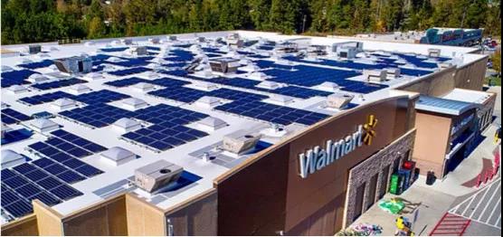 沃尔玛的屋顶大多是平屋顶或彩钢瓦屋顶,因此其安装或是用支架,或是直接在彩钢瓦表面铺设: