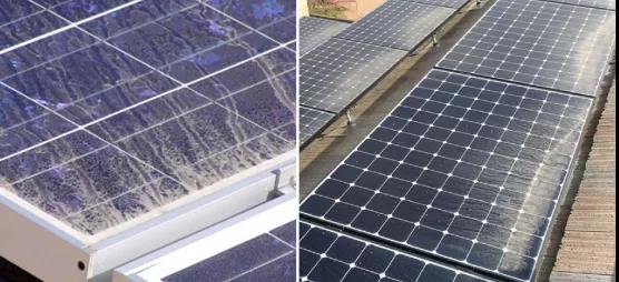 组件表面的积灰,如果周边环境好,下雨或清洗多,一般通过清洗运维或正常的下雨即可冲走。但在组件边框处,由于边框会比组件玻璃表面高出近2毫米,致使组件边缘出现一个小台阶。当组件安装的倾角小于15度时,这个台阶造成的积水足以覆盖到组件表面。