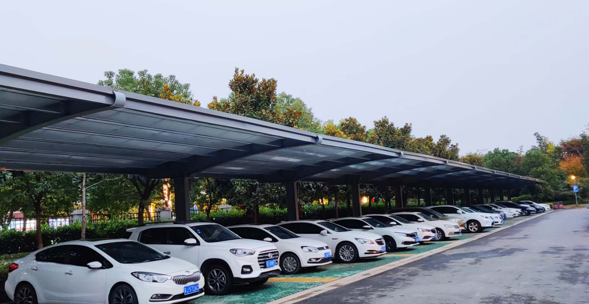 作为“大型车棚+屋顶”型式的分布式光伏项目,车棚顶面采用BIPV光伏一体化结构,以光伏组件代替车棚的顶面,实现发电功能的同时,还能起到遮阳防雨的作用。而且有效降低车棚下温度约15℃左右。