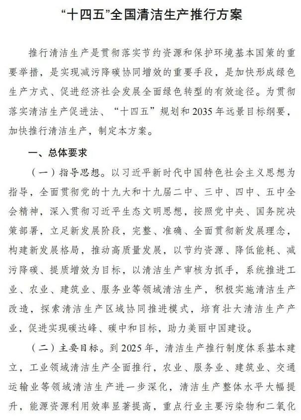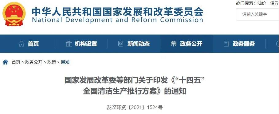 国家发改委、生态环境部、工信部、科技部、财政部、住建部、交通运输部、农业农村部、商务部、市场监管总局10部门近日联合印发《“十四五”全国清洁生产推行方案》。