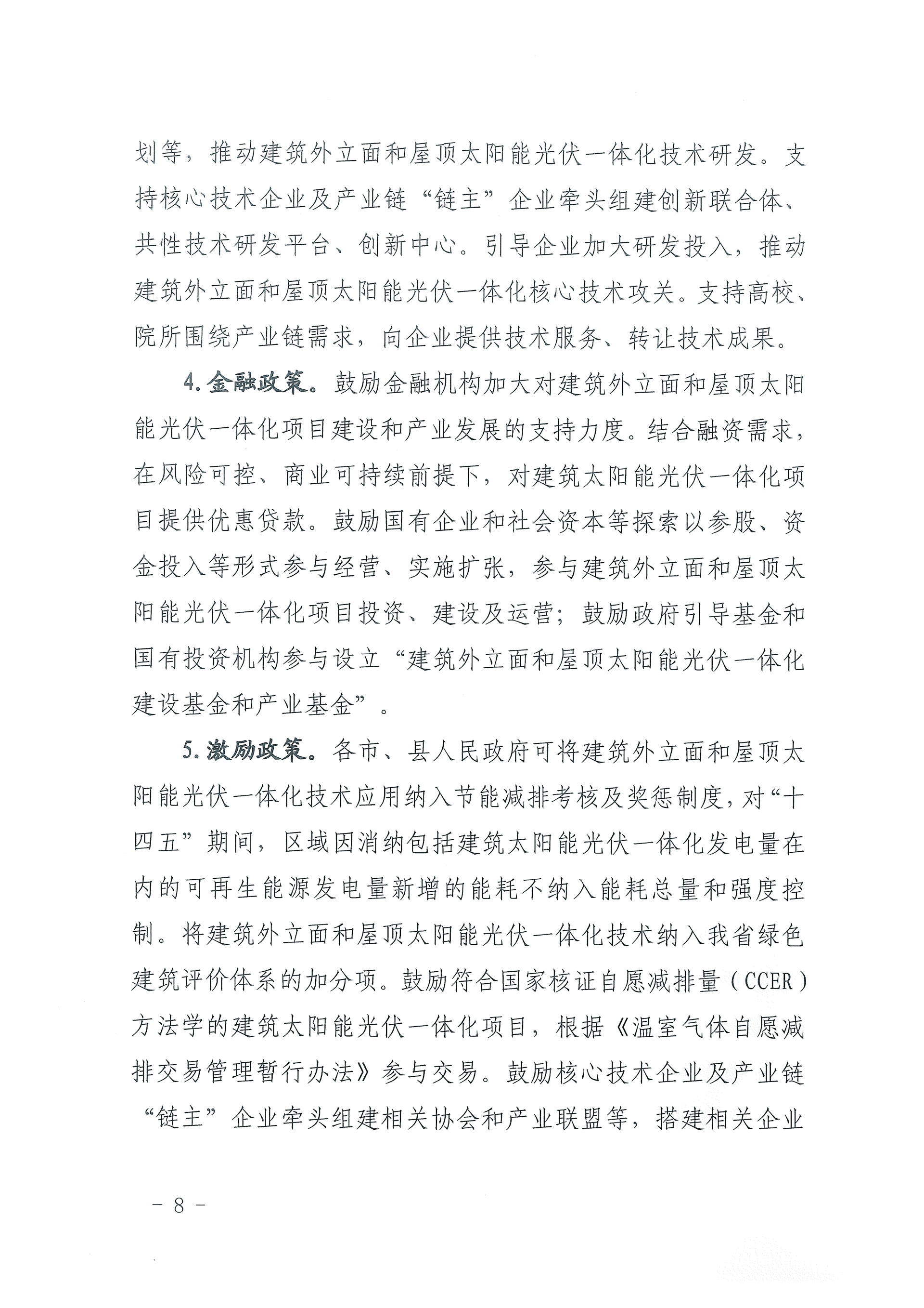 近日,陕西省住房和城乡建设厅、省发展和改革委员会、省科学技术厅、省工业和信息化厅、省财政厅、省生态环境厅、省能源局、中国人民银行西安分行、国网陕西省电力有限公司等九部门联合印发《关于大力发展建筑外立面和屋顶太阳能光伏一体化技术与应用的实施意见》(陕建发〈2023〉91号)(以下简称《意见》)。强调推进建筑太阳能光伏一体化建设,到2025年新建公共机构建筑、新建厂房屋顶光伏覆盖率力争达到50%,并推动既有公共建筑屋顶加装太阳能光伏系统。