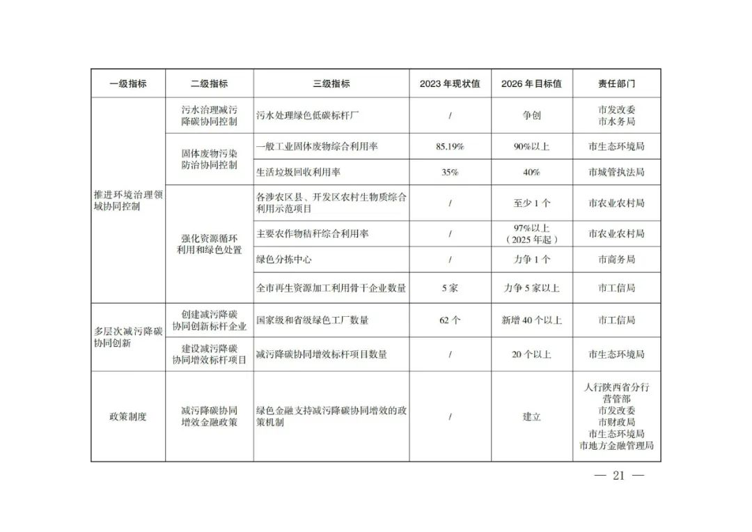 到2026年,形成一套减污降碳协同创新管理机制、模式路径和政策举措,构建“4+3+3+6”减污降碳协同创新“西安模式”,即开展能源、交通、工业、环境治理4个领域的减污降碳协同创新,在园区、企业、项目3个层次培育和遴选减污降碳协同创新标杆,出台减污降碳协同增效金融政策、碳评纳入环评新机制、碳排放信息纳入排污许可管理新机制3项减污降碳协同创新政策,提升市级层面试点工作机制创新、减污降碳协同创新评价指标体系创建、大气污染物与温室气体融合清单编制、污染物与温室气体监测核算、固定污染源排放量全口径核算、协同管理创新6种减污降碳协同管理和创新能力。投资约262亿元,推进66个减污降碳协同创新重点项目建设,确保全市非化石能源占能源消费比重达到22%以上,单位GDP能耗、主要污染物总量减排和单位GDP二氧化碳排放降低率完成省上下达目标。碳排放强度下降与生态环境质量改善协同推进取得明显成效,减污降碳协同度达到同类型城市领先水平,绿色低碳循环发展的经济体系初步形成。