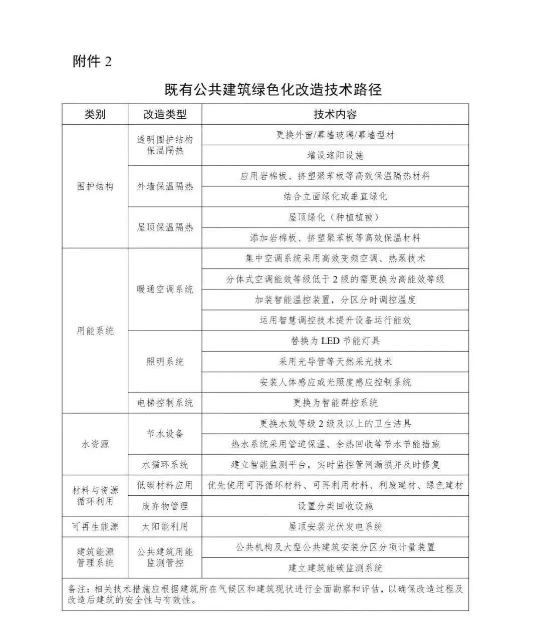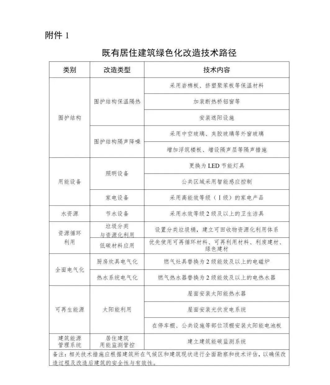 二、科学确定绿色化改造技术路径(一)提高既有居住建筑节能水平。提升城镇既有居住建筑绿色低碳性能,重点对外墙、屋面、外窗等部位实施保温隔热改造,推广应用节能隔声门窗、遮阳设施等适宜技术(附件1)。结合城镇老旧小区改造,在保障安全的前提下,因地制宜增设雨水回收利用系统等技术措施。优化公共区域照明、增设无障碍通道,完善适老化功能。引导居民在更换门窗、空调、壁挂炉等部品及设备时,采购高能效产品。鼓励采用设备变频控制等节能技术,降低公共区域能耗。(二)推进既有公共建筑低碳绿色化改造。以能效水平和环境质量提升为核心,遵循因地制宜、经济适用原则,优先开展围护结构节能改造,重点优化外墙、屋面保温及外窗热工性能,鼓励通过智慧调控方式提升设备运行能效,同步推进高效设备更新。推广可再生能源应用,在确保结构与消防安全的前提下加装屋顶光伏系统,具备条件地区可采用高效热泵技术。鼓励公共区域采用节能照明灯具及分区、感应等节能控制措施。支持建立建筑能源管理系统,对空调、照明、电梯等设备进行分项计量和能耗监测,逐步实施能耗限额管理。鼓励采用增设遮阳系统、玻璃结构层、新风系统等措施优化室内热湿环境和声环境,相关技术路径可参考附件2。(三)鼓励可再生能源应用。在既有建筑绿色化改造中,坚持“安全可靠、经济适用”原则,因地制宜推进可再生能源技术应用。结合《四川省太阳能资源建筑利用实施指南(试行)》,鼓励采用太阳能热水系统与空气源热泵耦合技术,优先满足居民生活热水与供暖需求;在太阳能资源丰富的A、B区,积极开展建筑光伏改造试点,落实厂房、国家机关办公建筑屋顶安装光伏行动。(四)推广绿色建材应用。加大绿色建材在城镇既有建筑改造中的应用推广,强化设计引领,设计文件中明确绿色建材比例。落实绿色建材产业链主要承载地和协同发展地政府投资项目绿色建材应用要求。鼓励成都、德阳、泸州政府采购支持绿色建材促进建筑品质提升政策实施城市形成可复制可推广的先进经验。