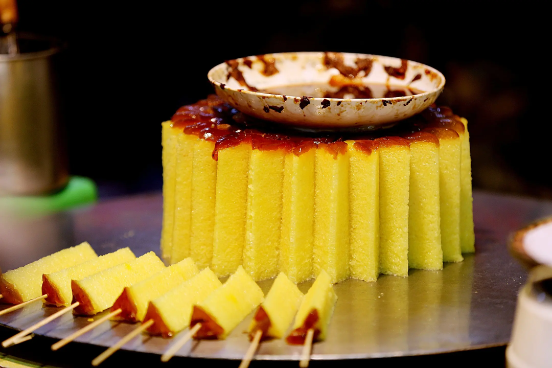 桂花糕可以说是西安很著名的一种小吃,看似朴实无华,实际上已经流传了三百多年了。桂花糕整体呈金黄色,唯有底部是浓浓的焦糖色泽,配上香甜细腻的桂花蜜,吃起来口感绵软,甜而不腻,让人爱不释手。完整的桂花糕是一个饱满的圆柱体,用特殊造型的刀切割后边缘一圈形成了齿轮状,这一片片的插上木棍取下来就是一块美味的桂花糕啦。