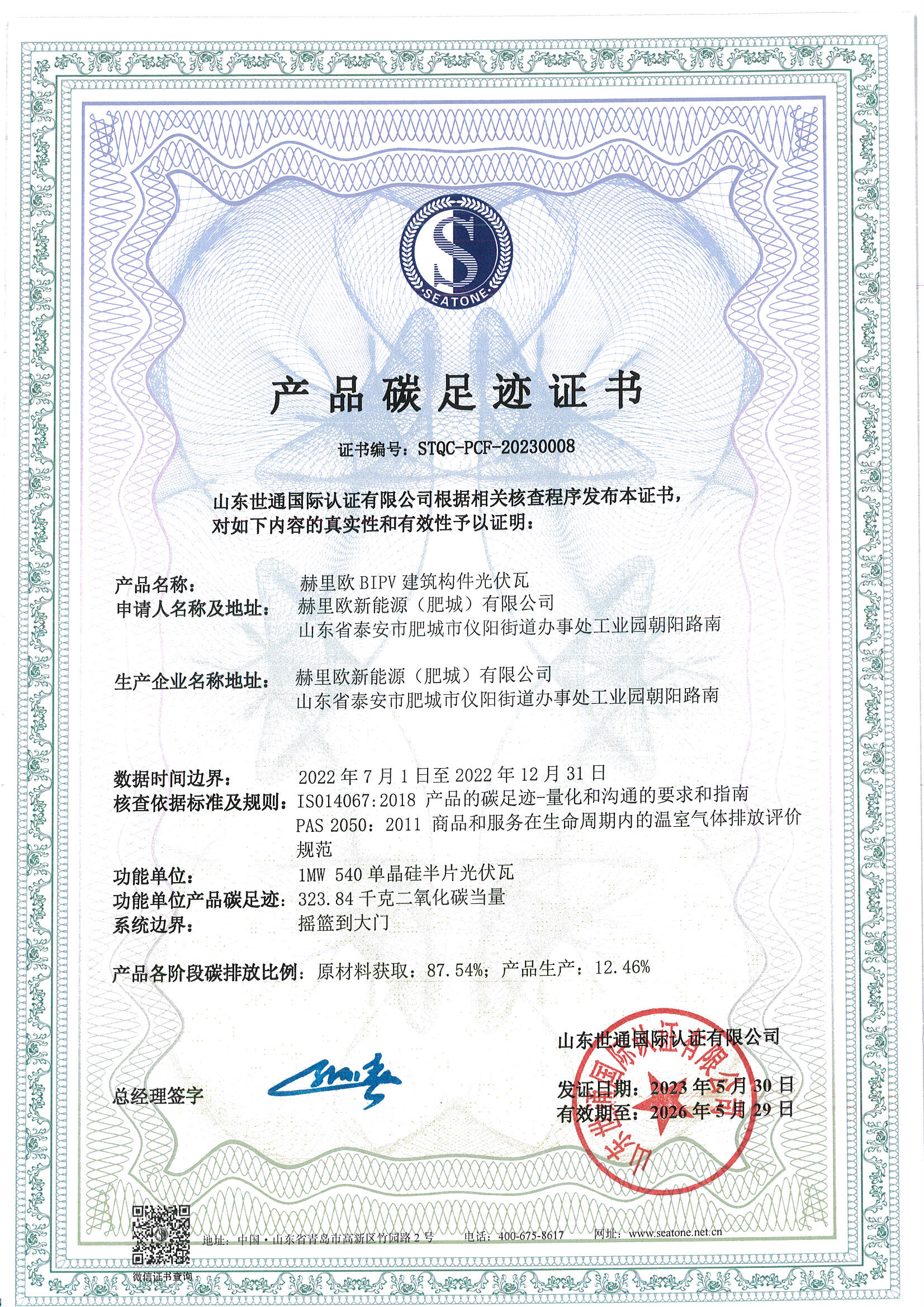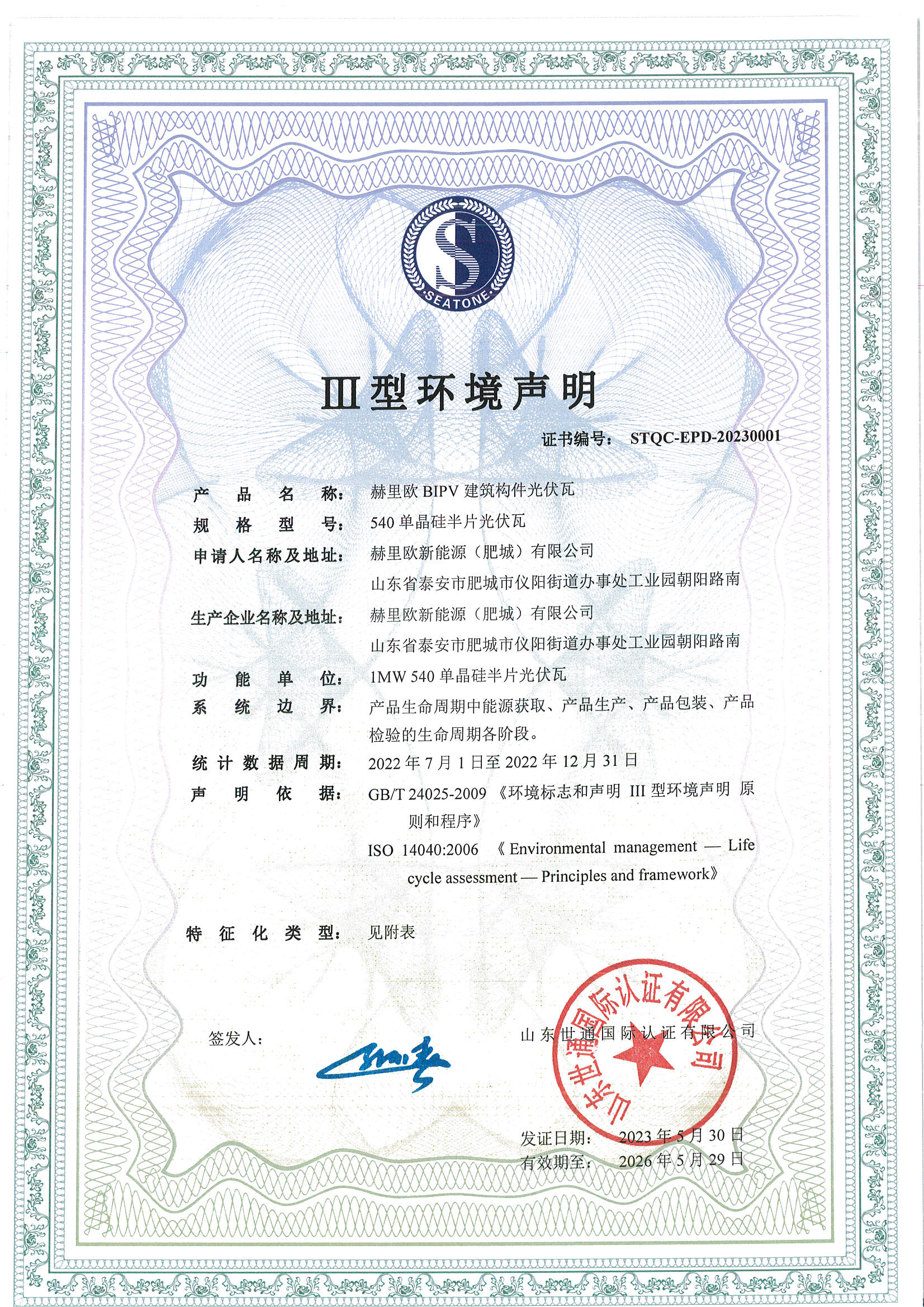2023年5月31日,山东世通国际认证有限公司为赫里欧新能源(肥城)有限公司批准<产品碳足迹认证、iii型环境声明证书>。近日赫里欧获得了颁发的证书。