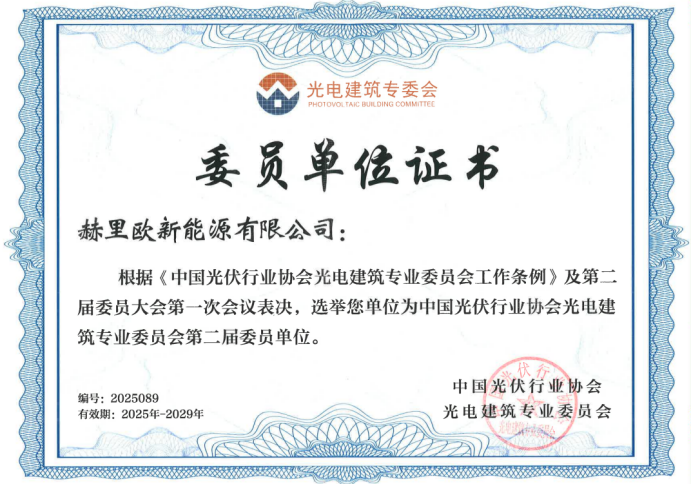 赫里欧新能源获选中国光伏行业协会光电建筑专业委员会第二届委员单位 发布日期:2025-03-24
