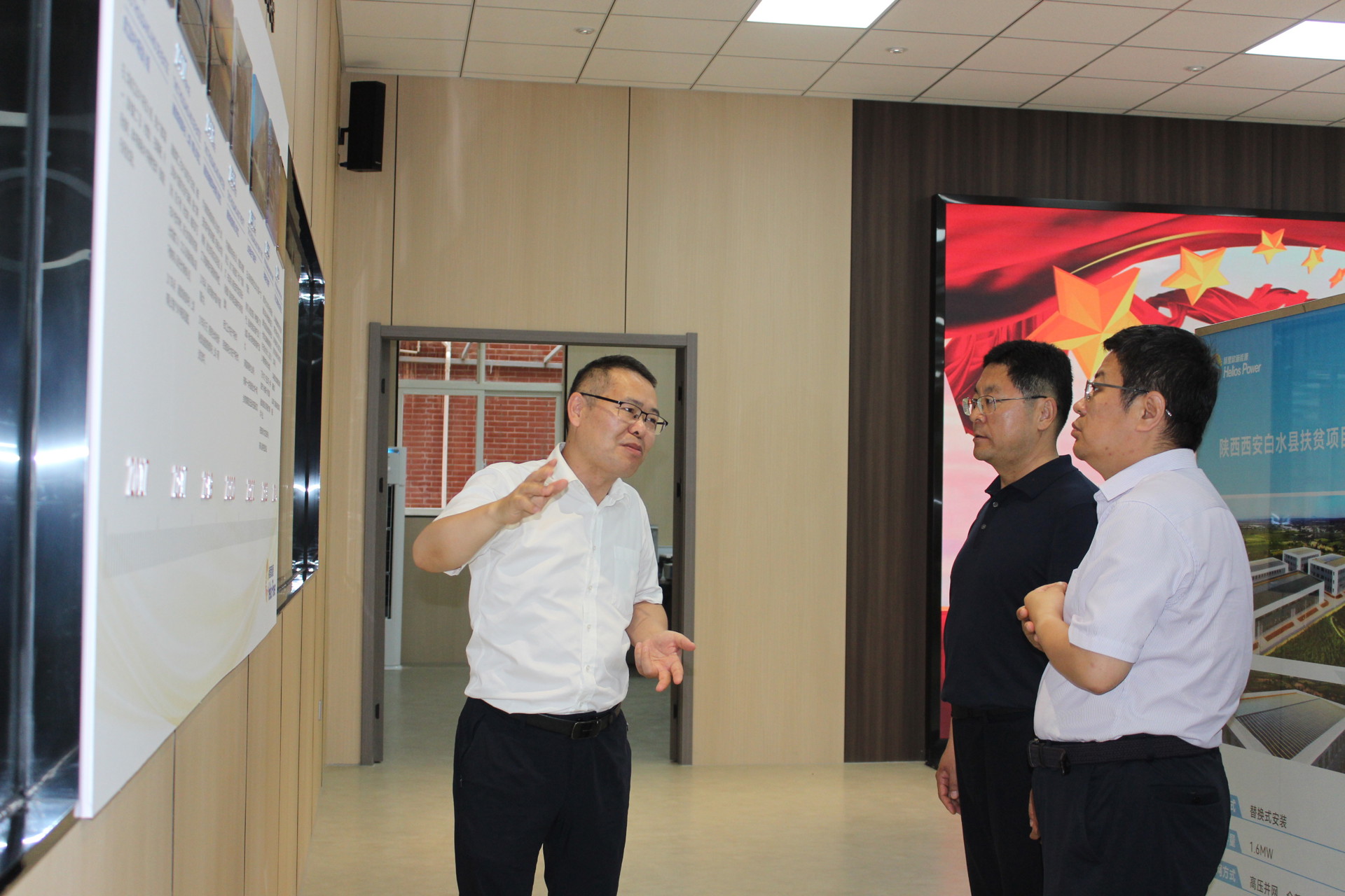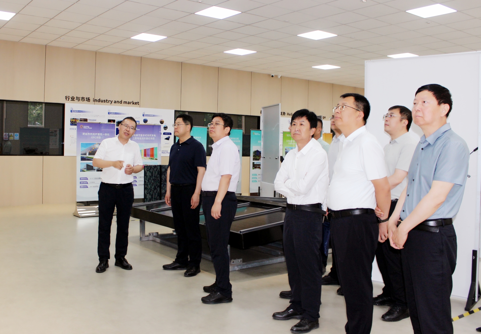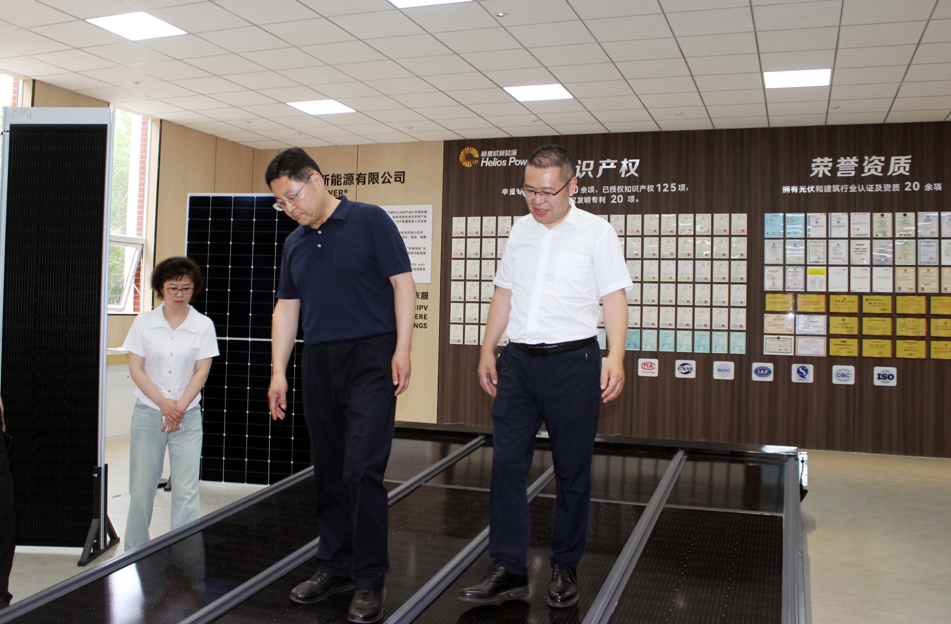 在赫里欧新能源有限公司展厅,杨成林书记一行重点参观了全球领先的绿色智能发电建材系统,包括光伏瓦、装配式光伏墙、光储充一体化车棚等创新产品。并对赫里欧在安全低压技术、防火防水一体化设计、轻质高效发电建材等领域的突破给予高度评价,赫里欧团队详细介绍了其核心技术优势——安全低压直流系统(120V)、A2级防火建材认证、抗风压防水一体化设计,解决了传统光伏在建筑应用中的火灾、漏雨、承重等痛点。杨成林指出:“赫里欧的BIPV技术与神木市新能源产业培育、建筑绿色转型战略高度契合,双方可携手探索多元落地模式,实现互利共赢。”