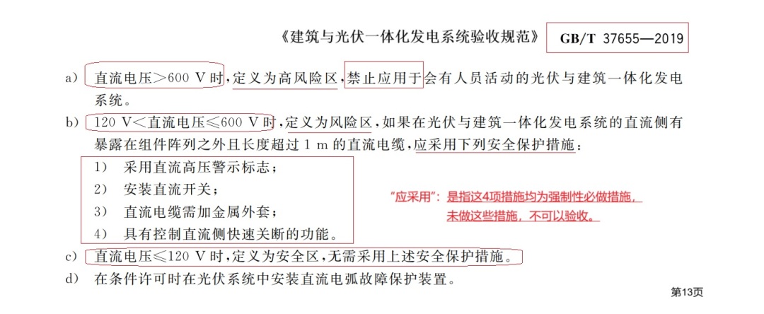 3、中国标准GB/T37655-2019《光伏与建筑一体化发电系统验收规范》6.7条定义直流电压≦120V时,为安全区,无需采用安全保护措施。同时定义高于该电压所有电缆必须加装金属外套和直流拉弧快速关断控制。