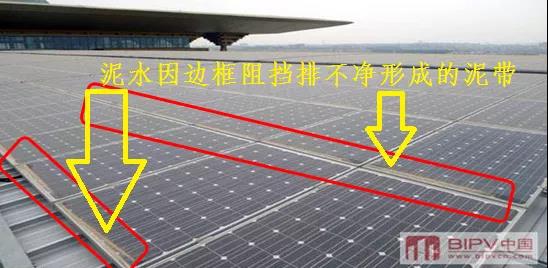 组件表面的积灰,如果周边环境好,下雨或清洗多,一般通过清洗运维或正常的下雨即可冲走。但在组件边框处,由于边框会比组件玻璃表面高出近2毫米,致使组件边缘出现一个小台阶。当组件安装的倾角小于15度时,这个台阶造成的积水足以覆盖到组件表面。