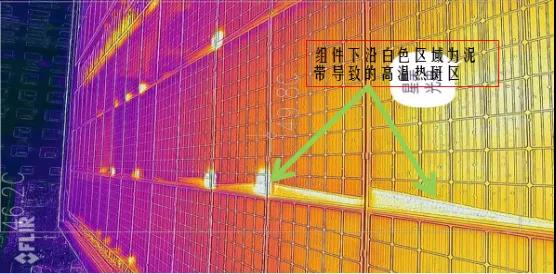一年中,发电量最高的季节就是在春夏之交,阳光充沛的同时环境温度低,因而光伏阵列的电流是最大的。而泥带遮挡下的屋顶电站,其红外照片显示的热斑效应,比隐裂更严重,因为其面积更大,而且由于组件安装水平方向的倾斜会造成泥带在组件下沿的一边更宽,在组件下沿的一个角积聚的泥带更多,遮挡更严重,该部位在红外照片中尤其明亮。