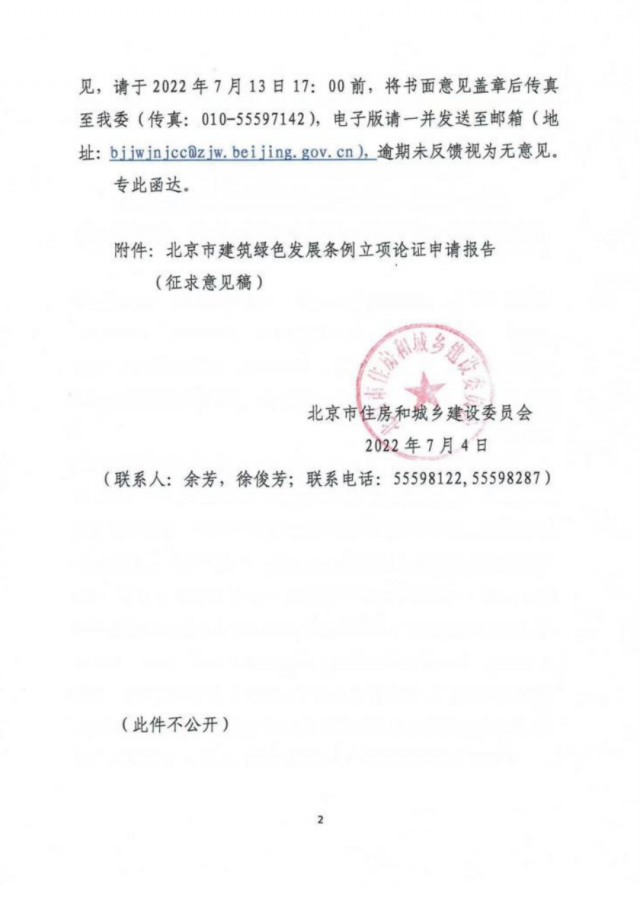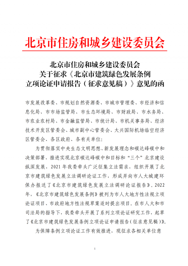 7月4日,北京住房和城乡建设委员会向北京市各相关部门印发关于征求《北京市建筑绿色发展条例立项论证申请报告(征求意见稿)》意见的函,就北京市2021年组织开展的北京市建筑绿色发展立法调研论证工作形成立项论证申请报告。