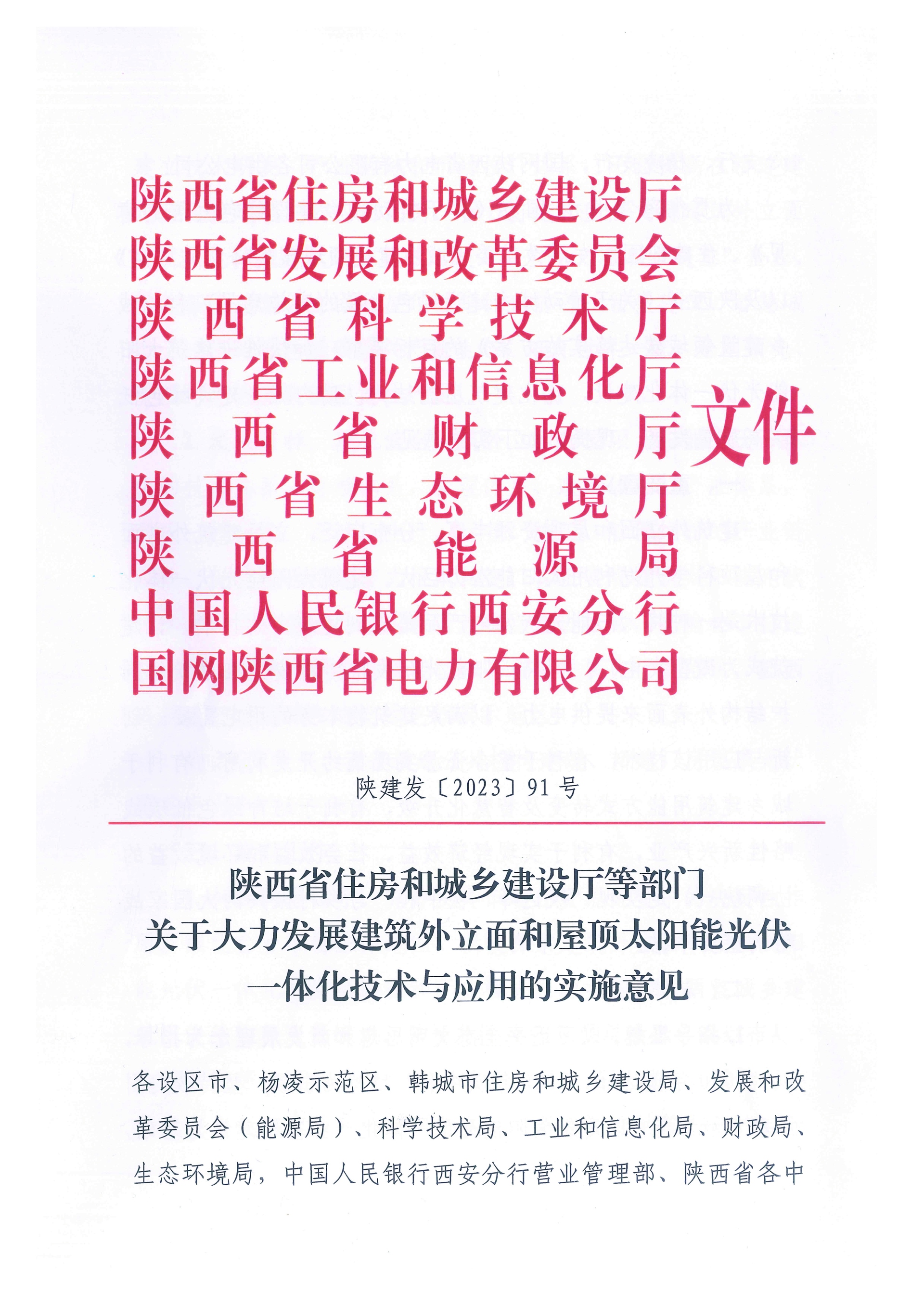 近日,陕西省住房和城乡建设厅、省发展和改革委员会、省科学技术厅、省工业和信息化厅、省财政厅、省生态环境厅、省能源局、中国人民银行西安分行、国网陕西省电力有限公司等九部门联合印发《关于大力发展建筑外立面和屋顶太阳能光伏一体化技术与应用的实施意见》(陕建发〈2023〉91号)(以下简称《意见》)。强调推进建筑太阳能光伏一体化建设,到2025年新建公共机构建筑、新建厂房屋顶光伏覆盖率力争达到50%,并推动既有公共建筑屋顶加装太阳能光伏系统。