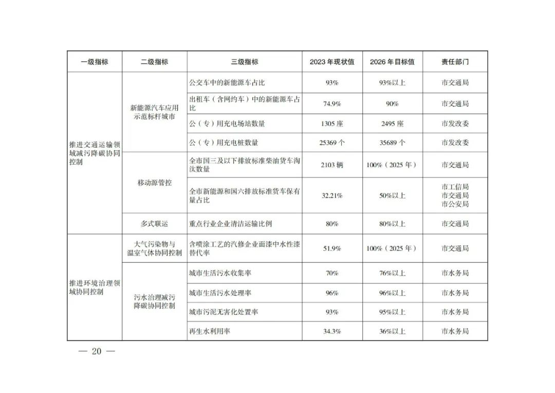 (一)打造新能源汽车应用示范标杆城市。以公共交通、市政环卫、物流配送、公务用车等公共领域用车为重点,大力推广新能源汽车,推动城市公共服务车辆电动化替代。每年新增或更新的公交车、出租车(含网约车)、垃圾清运车、轻型环卫车辆,全部采用新能源或清洁能源车辆(含国六排放标准车辆,以下同)。每年新增或更新的物流配送和公务车辆中,新能源或清洁能源车辆比例分别不低于90%和80%。推进既有交通基础设施节能降碳改造提升,建设一批低碳(近零碳)车站、机场、高速公路服务区。建成适度超前、布局合理、车桩相宜、智能高效的充电基础设施体系。鼓励具备技术优势、创新优势的智能充电科技企业参与充(换)电网络体系建设,建立信息数据互联互通、智能技术标准体系完善、运管管理机制健全的新型充(换)电基础设施体系。到2026年,全市公交车中新能源车占比达到93%以上,出租车(含网约车)中新能源车占比达到90%。主要城区形成半径不大于2公里的充(换)电服务圈,实现街办(镇)重点区域充(换)电基础设施、高速服务区充(换)电基础设施全覆盖,累计建设公(专)用充电场站2495座、公(专)用充电桩35689个,满足85万辆电动汽车的充(换)电需求。