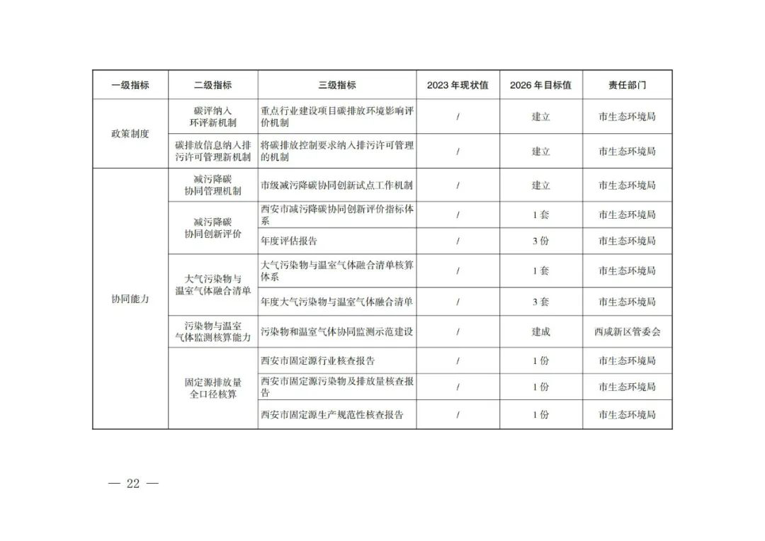 到2026年,形成一套减污降碳协同创新管理机制、模式路径和政策举措,构建“4+3+3+6”减污降碳协同创新“西安模式”,即开展能源、交通、工业、环境治理4个领域的减污降碳协同创新,在园区、企业、项目3个层次培育和遴选减污降碳协同创新标杆,出台减污降碳协同增效金融政策、碳评纳入环评新机制、碳排放信息纳入排污许可管理新机制3项减污降碳协同创新政策,提升市级层面试点工作机制创新、减污降碳协同创新评价指标体系创建、大气污染物与温室气体融合清单编制、污染物与温室气体监测核算、固定污染源排放量全口径核算、协同管理创新6种减污降碳协同管理和创新能力。投资约262亿元,推进66个减污降碳协同创新重点项目建设,确保全市非化石能源占能源消费比重达到22%以上,单位GDP能耗、主要污染物总量减排和单位GDP二氧化碳排放降低率完成省上下达目标。碳排放强度下降与生态环境质量改善协同推进取得明显成效,减污降碳协同度达到同类型城市领先水平,绿色低碳循环发展的经济体系初步形成。